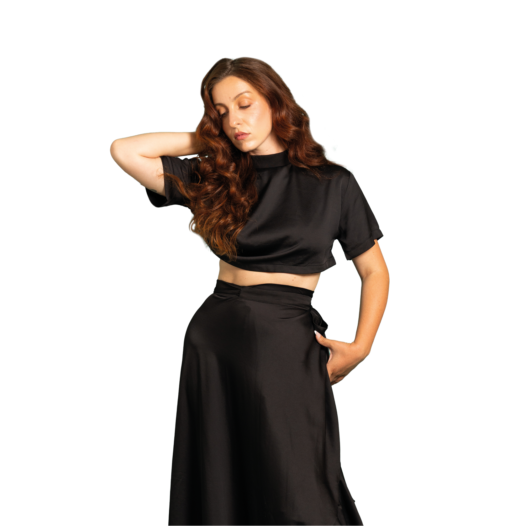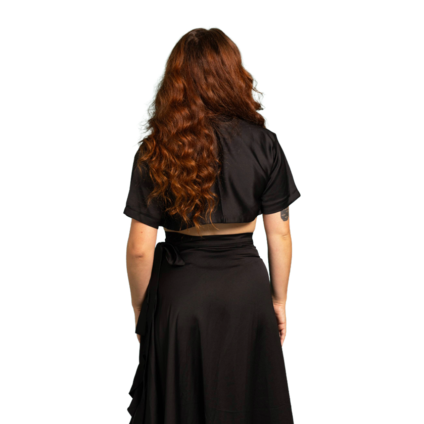 Ensemble deux pièces en crêpe de viscose satinée noir profond dispose d’un tombé lourd et fluide, qui accompagne chaque mouvement. Cette matière enveloppe toute en douceur la silhouette et offre une allure sophistiquée moderne.