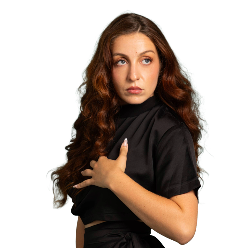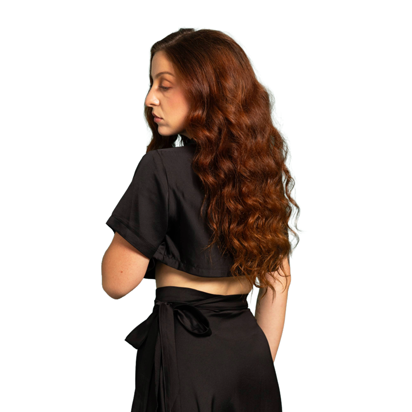 Le crop-top, rehaussé d’un col bord-côtes, apporte une touche de décontraction qui contraste élégamment avec la brillance du tissu. Deux pinces asymétriques soulignent la courbe plongeante du devant du top, apportant de la cohérence à l’ensemble.