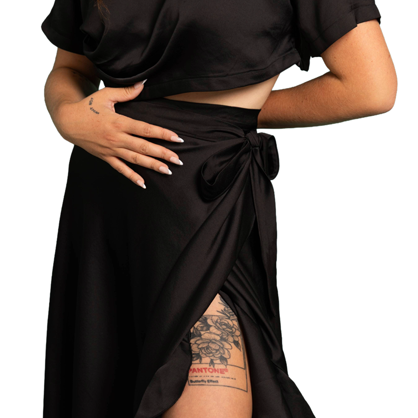 La jupe portefeuille, à nouer au dos ou sur le côté selon l’envie, se porte de manière asymétrique, créant un jeu de lignes dynamiques et féminines. Sa coupe modulable permet d’ajuster le drapé et d’accentuer son aspect graphique