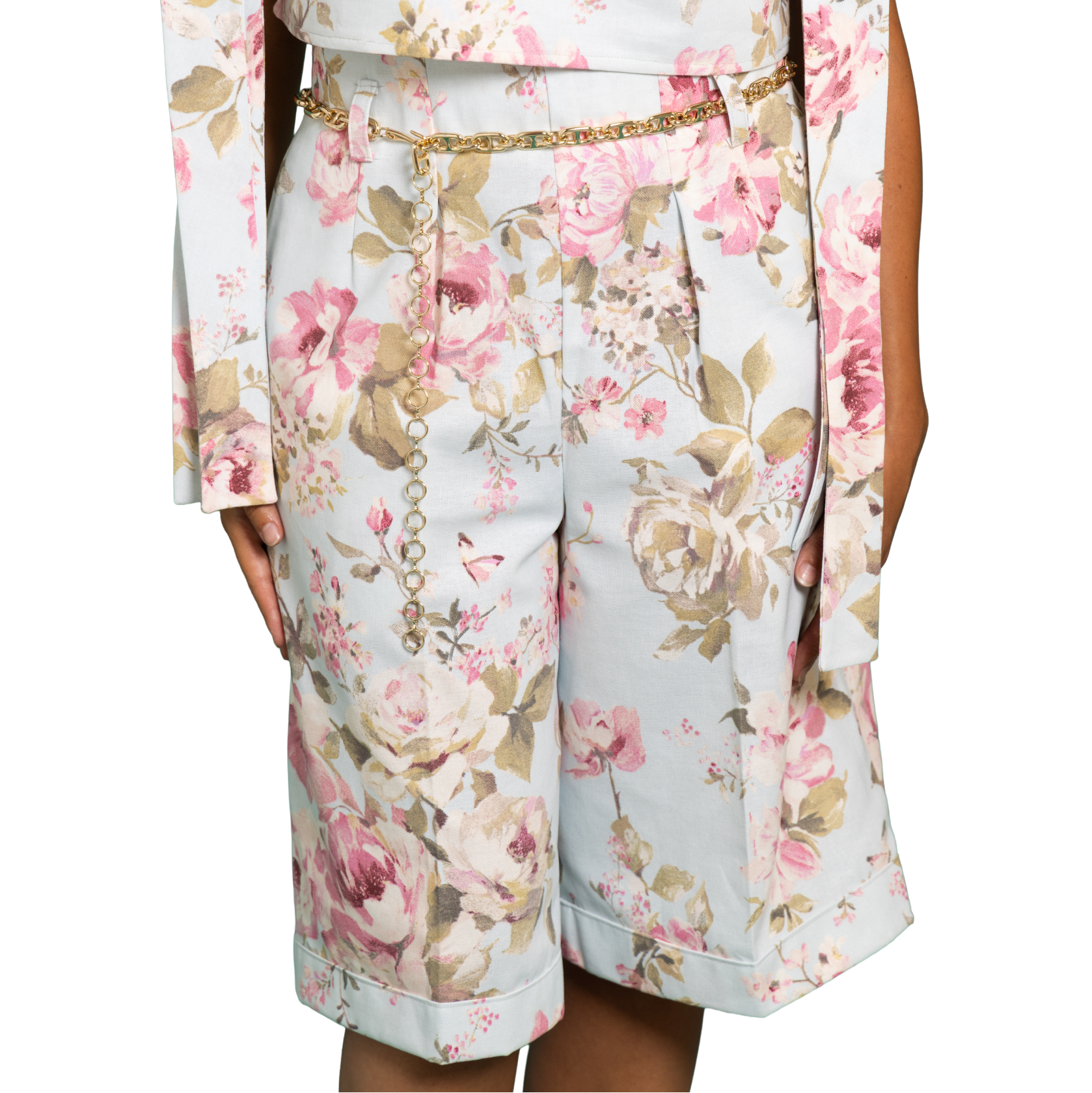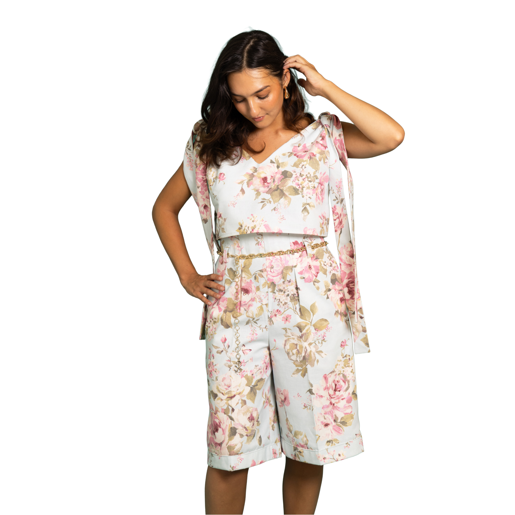 Le bas est un bermuda taille haute, doté de passants pour accessoiriser la taille et de poches plaquées.